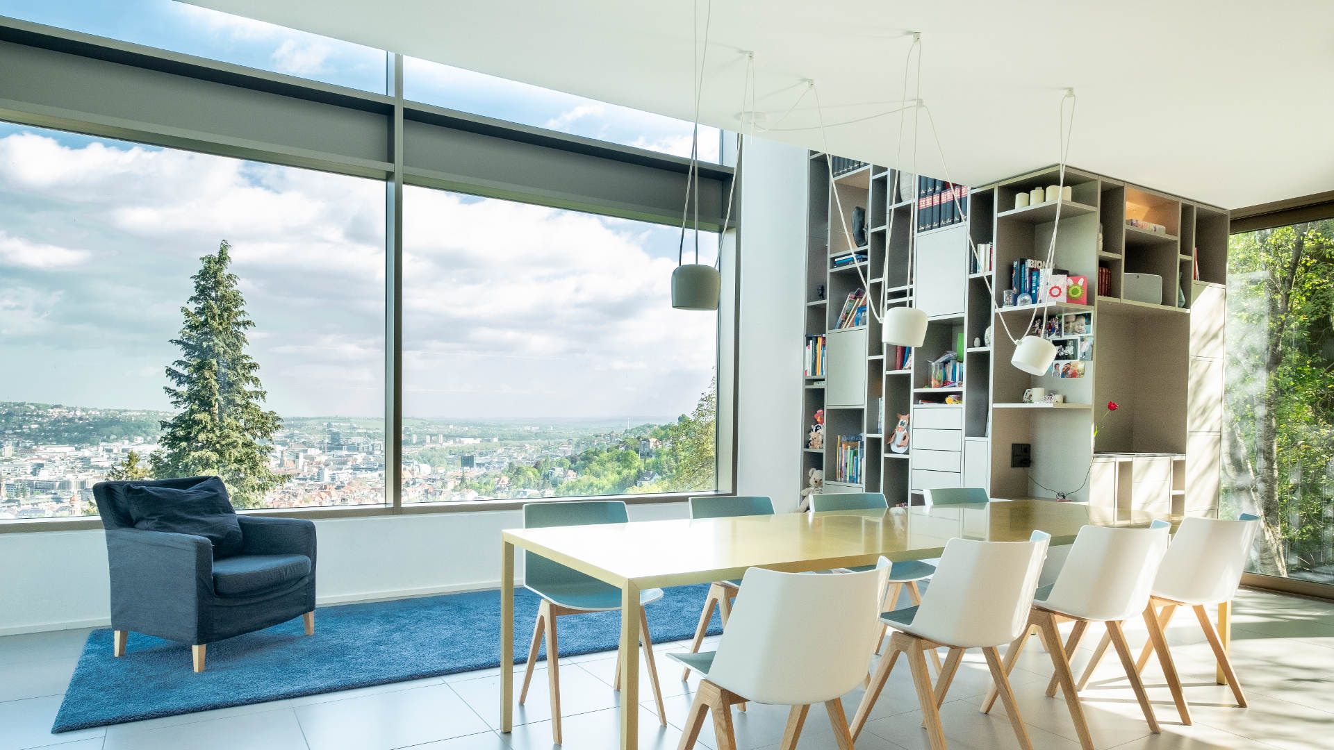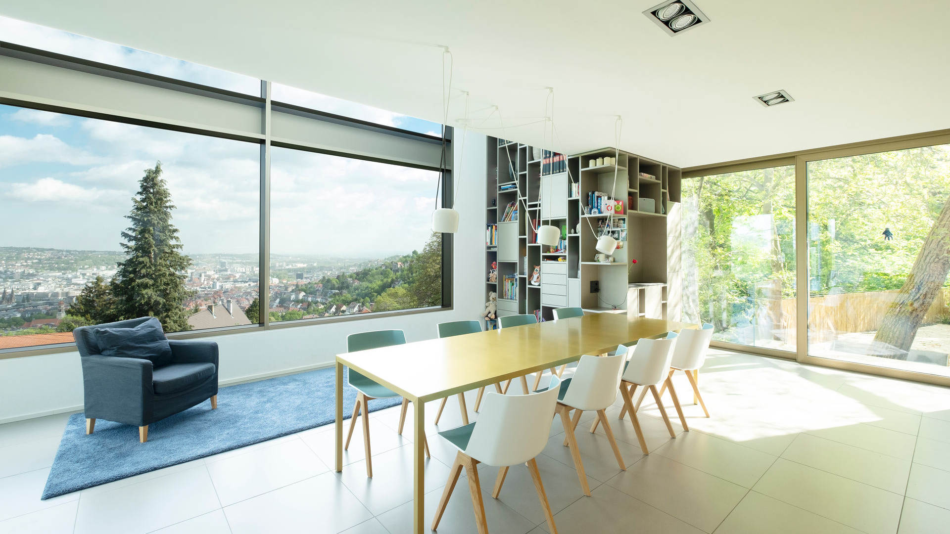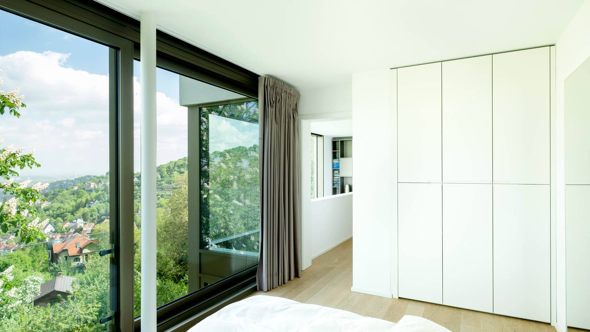 Gestalterisches Hauptelement ist eine über Eck laufende Wandverkleidung, die Garderobe, Gäste-Bad sowie eine Spiesekammer optisch integriert sowie das sich über 2 Geschosse erstreckende Bücherregal