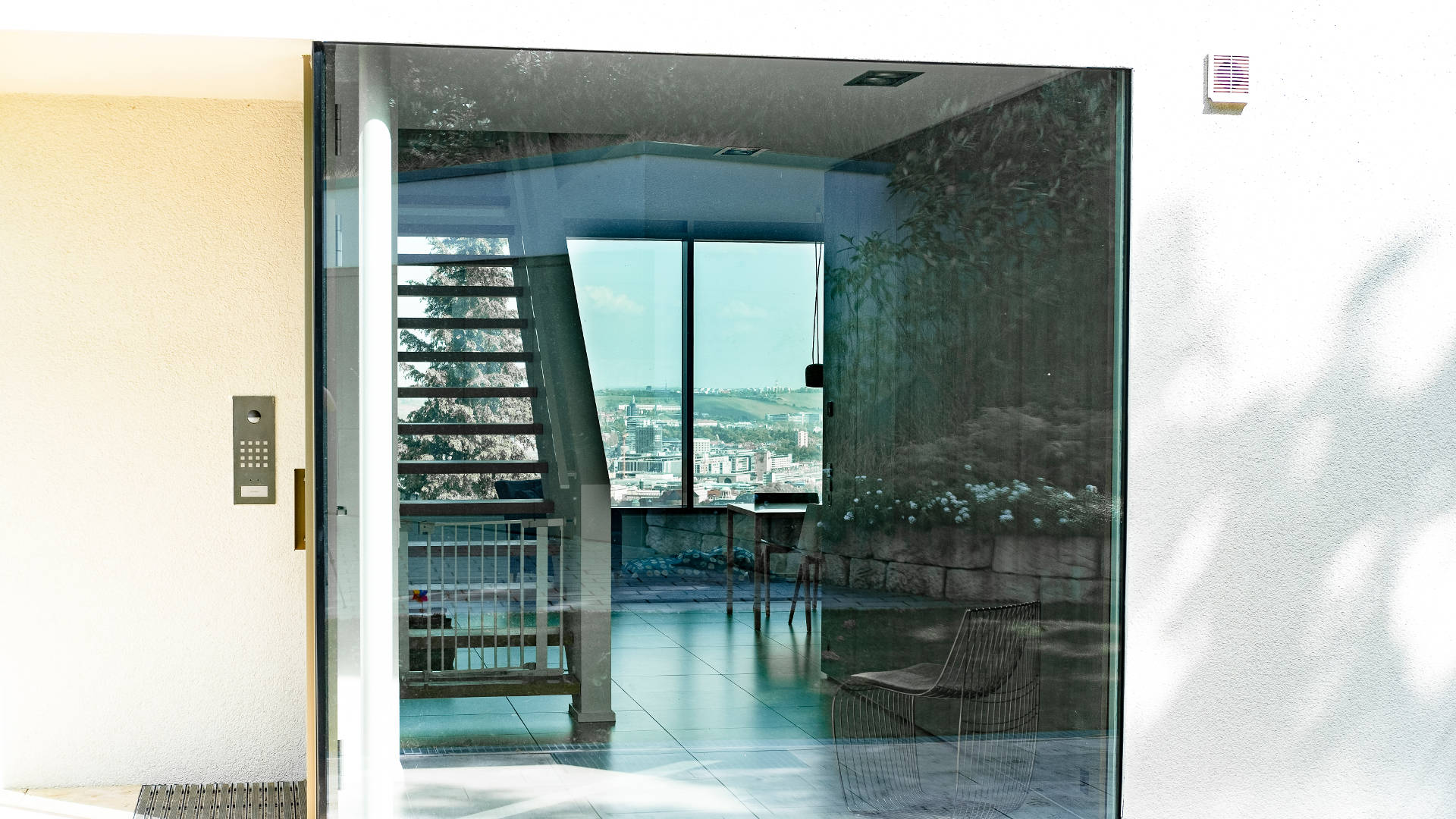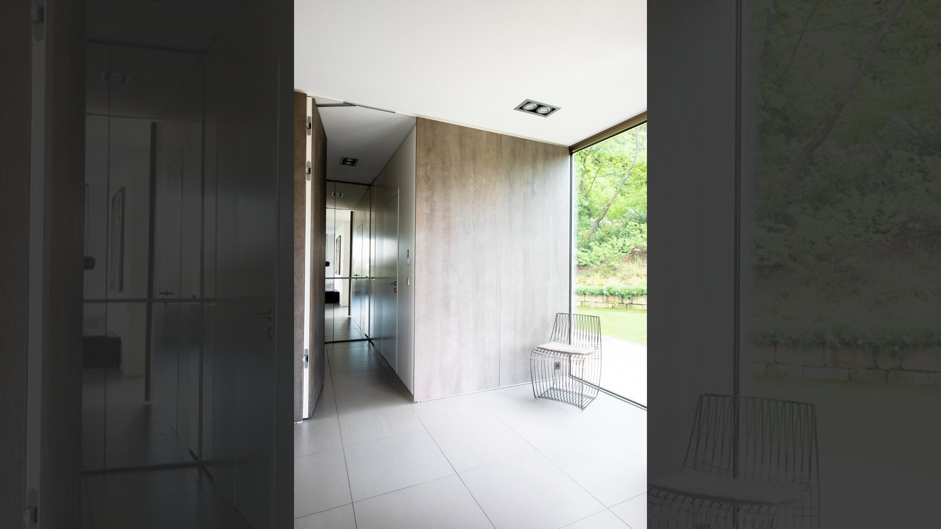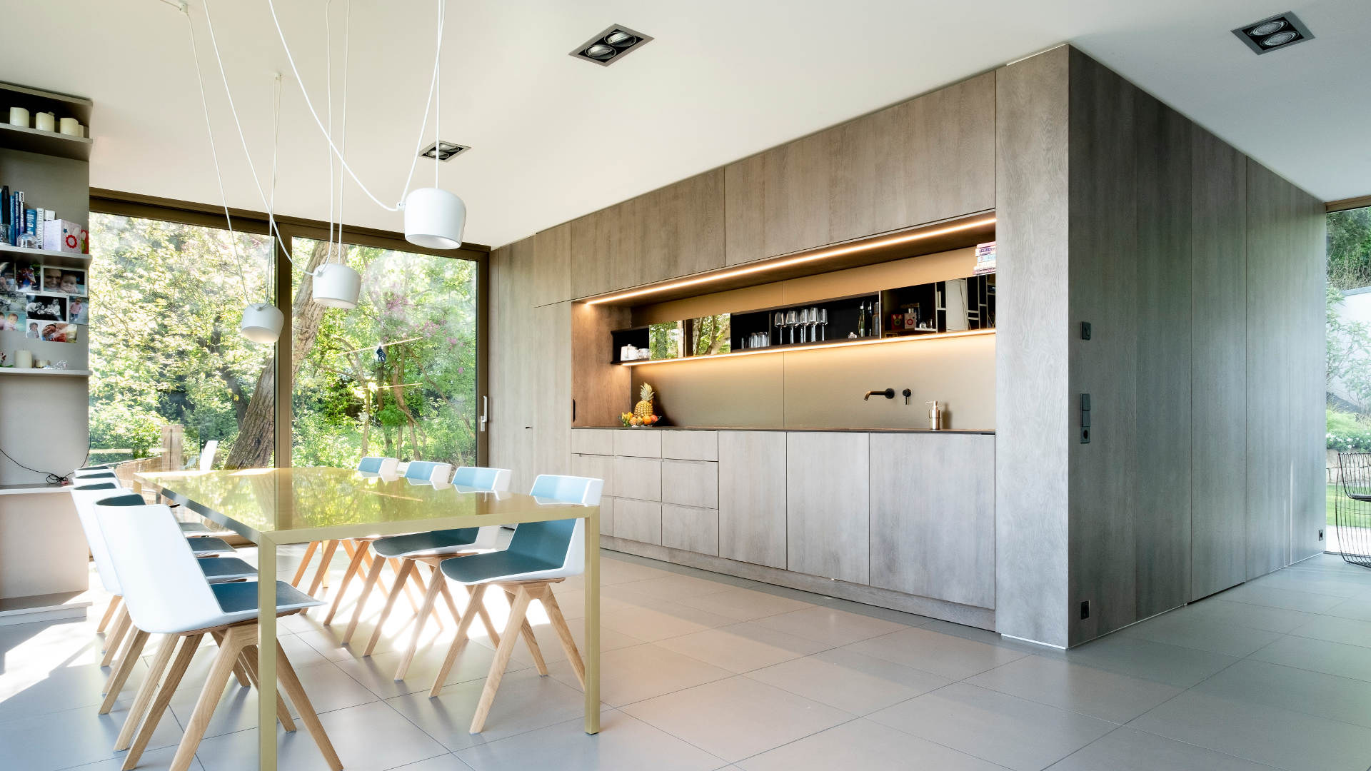 Gestalterisches Hauptelement ist eine über Eck laufende Wandverkleidung, die Garderobe, Gäste-Bad sowie eine Spiesekammer optisch integriert sowie das sich über 2 Geschosse erstreckende Bücherregal
